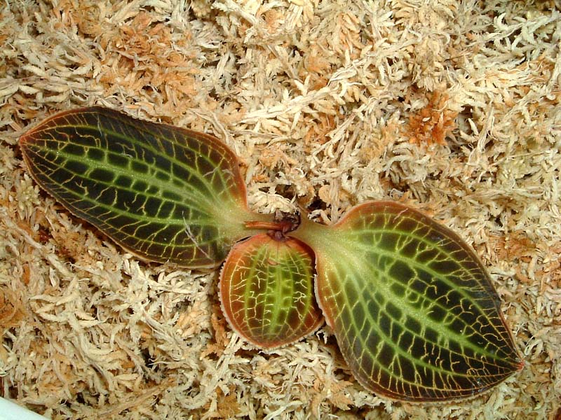 2.Anoectochilus の一種タッパー内で栽培すると、1)ミズゴケを湿らせておけば潅水の必要が無いので、葉が汚れず本来の美しさが損なわれない、2)ナメクジの食害の心配が無いのでジュウェルオーキッドには最適である。前種よりは、葉が大きく、葉質も薄い。斑がはっきりして大変美しい。