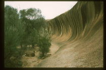 4.Wave Rock あたかも津波が押し寄せてくるかのごとく感じさせる。どこにも岩の切れ目や裂け目が無いのが凄い。此処だけ岩が盛り上がっている。周囲は大雨が降り続くと、冠水するそうである。拡大 |