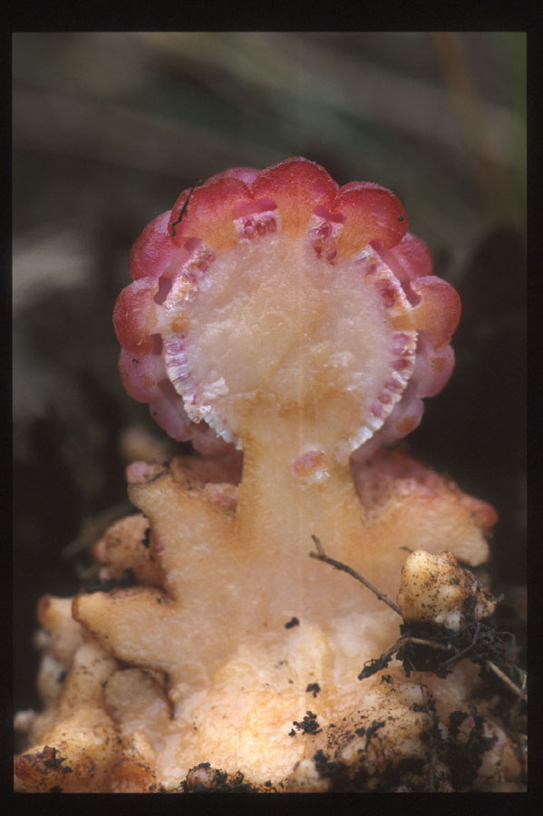 3.寄生植物 標高3000m位、開けた草地に生育するイネ科の植物の根元にあった。無線施設を警備している兵隊さんが、キノコを見つけたと言って持ってきた。球花は直径約2cm。拡大 |
