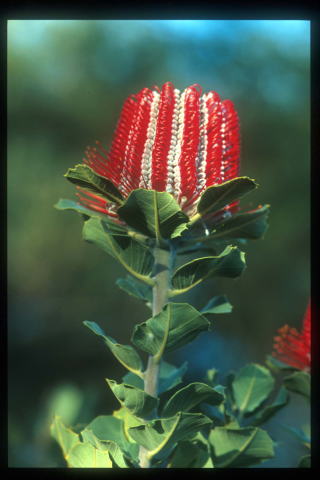 | 右の写真、バンクシア コクシネア’Banksia coccineaオーストラリアで最も美しいといわれるバンクシア。花の直径は8−10cm。樹高30cm位でも開花していたが、一般的には樹高は2−3mとなる。 オーストラリアの夏は乾燥するので、山火事が多く、植物は山火事に適応した植物が多い。特にバンクシア属の果実は非常に堅く、山火事で焼かれてはじめて割けて種子を地上に落とす。 バンクシア、ユーカリ、ハケアなど、樹木の花はこのような糸状花の集合花序タイプが多い。花の付け根には蜜が分泌され、小鳥もこの蜜をエサにしている種が多く、蜜をエサにする小鳥を総称してハニーイーターと呼んでいる。 |