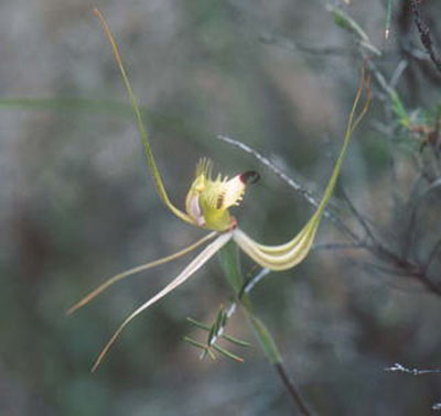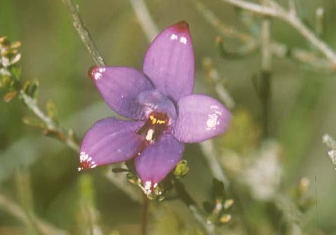 左の写真、カラデニア ファルカータ, caladenia falcata.最も種分化をしている属で、数十種が知られる。この種は乾燥した林床に生育し、花弁、がく片、唇弁が肉厚で下垂しないタイプの種。花弁、がく片が薄く、白色ないし濃赤色で下垂する種も多数ある。 |
