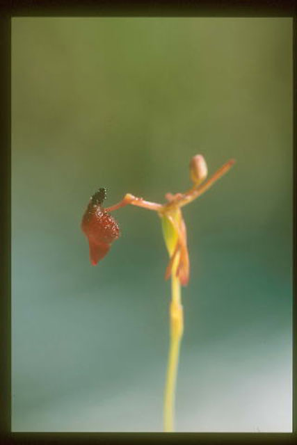 | オーストラリア・パースにおいて第1回国際ラン科植物保護会議が、2001年9月24日から9月29日までの5日間にわたり開催されました。会議の後、現地のラン研究者 Andrew Brown博士の案内で行われたパース周辺の地生ラン見学ツアーに参加しました。ハンマーオーキッドとして知られるドラカエア グリプトドン(Drakaea glyptodon。次の写真)をはじめ、太陽光線があたっている時だけ開花するサンオーキッド(テリミトラ クリニタ・Thelymitra crinita)など特殊な形態や性質のランを撮影してきました。 | |