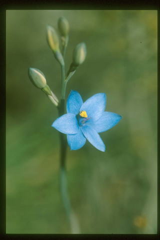 | 右の写真、 テリミトラ クリニタ、サンオーキッドと呼ばれ、太陽光線が当たり気温が高い時だけ開花する性質のラン。中央の黄色の部分が花粉塊であるが、粉状である。この属のランは全て同様の性質を持ち、花色は青の他に鮮黄色、白色、黄色と褐色のまだら状などの種もある。また唇弁の形が、花弁ほとんど違わない点も本属の特徴である。 | ![]() |