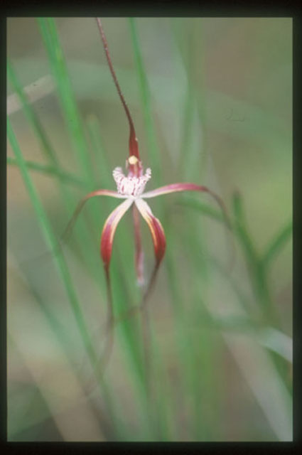 4.Caladenia chapmanii 草丈は30−40cmの中型種。花弁、がく片は基部以外は濃紅色。唇弁の縁の切れ込みは浅い。 |
