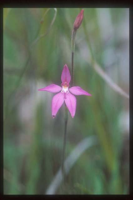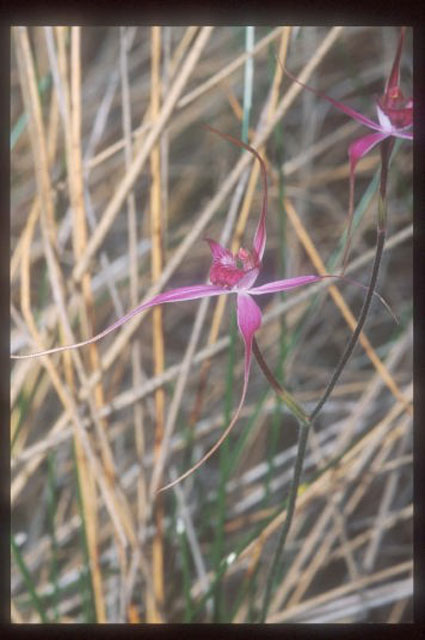 12. Caladenia harringtoniae 花は大変美しく、濃桃紫色。疎林内のやや湿った場所に生育する。個体数は非常に少ない。Cal. christineaeとの自然交雑種も知られる。 |