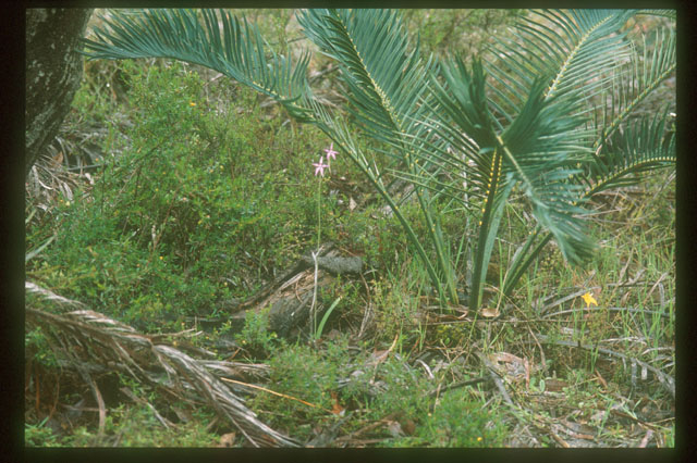 8.ZamiaとCaladenia ザミアはソテツの仲間だが全体的に大柄である。左横に見えるピンクの花はCal. latifolia、右の黄色はCal.flavaである。 |