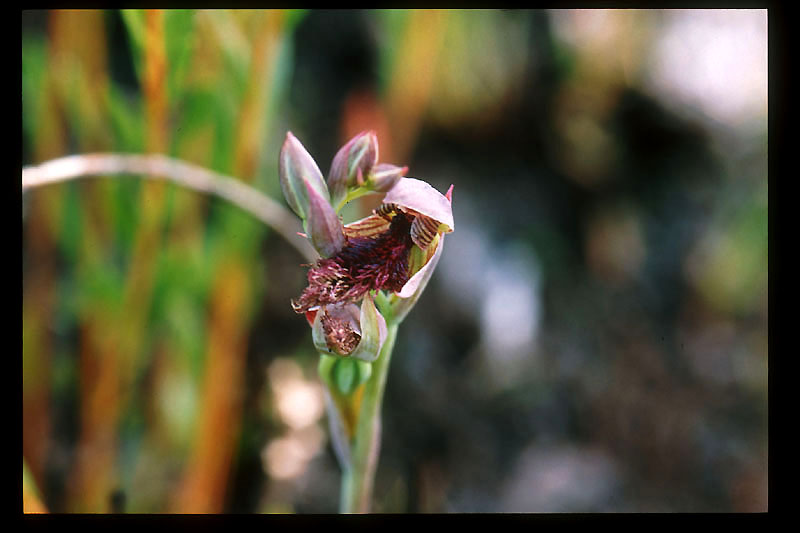 | 13. Calochilus robertsonii やや湿った明るい草原で見つけた。花はまだ全開していないので、リップが展開していない。リップ表面のヒゲが特徴。拡大 |