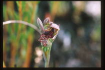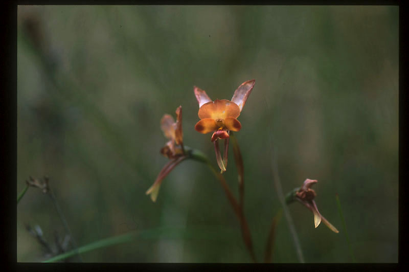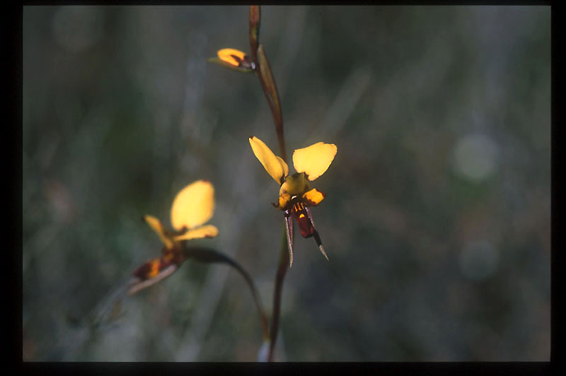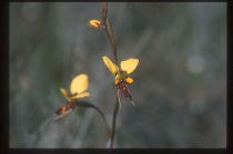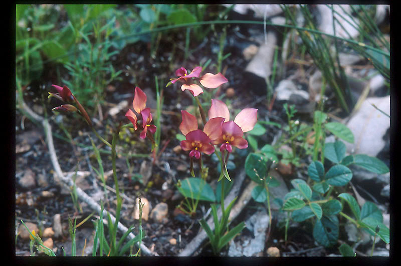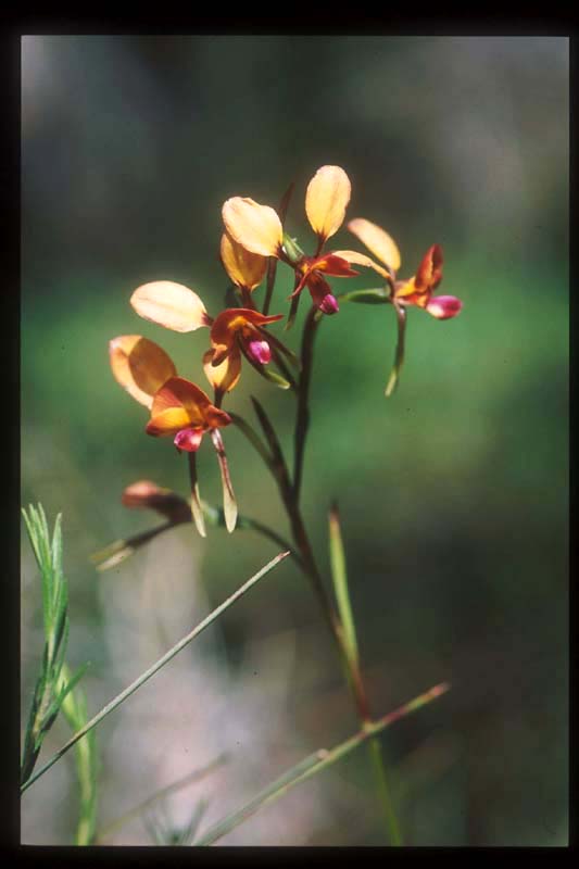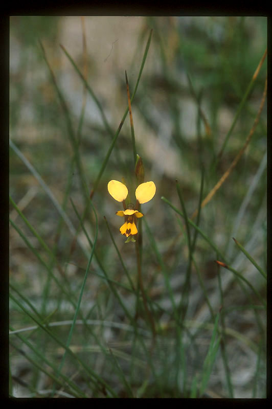 | 9. Diuris sp.nov. パース周辺だけでも、数種のディウリスが分布している。現場で見た時には、どれも同じように見えたが、写真を比べると差異がよく判る。これは、Brown博士が未記載の種であると言っていた。拡大 |