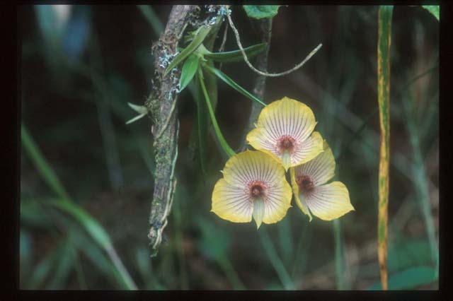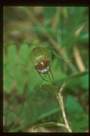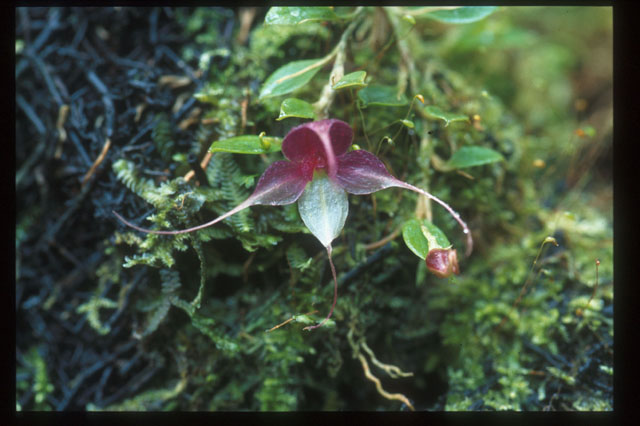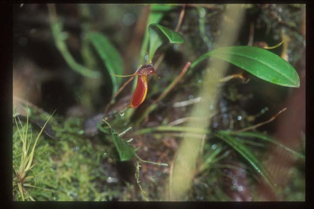 No.10.Masdevallia コロンビア国境沿いチレス山の太平洋側斜面の雲霧林内(2500m)。1日車で走っても全く人に会うことはなかった。写真は道路際からほんの2-3mの場所で撮影した。Masdevallia 属の花は外側のがく片ばかりが大きく、かつ互いに癒合して筒状になるものが多い。 |