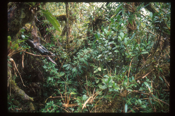 No.8. 雲霧林低木層の内部 エクアドルでは高地の雲霧林の低木層はリピドクラドゥムという細い茎で長さが20-30mになる竹で覆われている。そのために、日中でも内部は暗く、湿度も100%近い。林床には倒木が幾重にも折り重なり、その表面は大小さまざまな植物に覆われている。 |