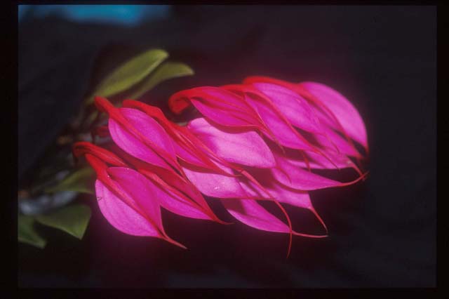 | No.9.Masdevallia rosea No.8.の林内の倒木上に咲いていた。周囲2-3m以内だけでも10- 20種のランが自生している。また発芽後やっと葉が出たばかりの大型のランの苗などもあり、あらゆる植物の苗床の役割をしている。花は目を見張るような美しいバラ色、楕円状の部分は側がく片が癒合し、中央の細いのが背がく片である |