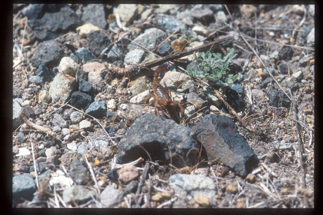 No.12.サソリ(2000m) アンデス山脈の中央台地あるいは盆地部分はシエラと呼ばれ,大地が剥き出しになった乾燥地帯である。写真はクエンカの南、ライオン川沿い。付近には中型(高さ1-3m)のサボテンやティランジアが群生していた。このような場所にはサソリが多い。ちなみに我々が滞在したクエンカのロッジの浴室にもサソリが出没した。 |