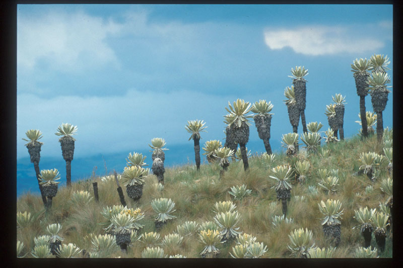 山の北側はコロンビア領。林立するキク科のEspeletia sp.。最高3m前後に達し、白毛が密生する大きな葉は密につき、1年で2-3cmしか生長しない。2種が見られた。 |