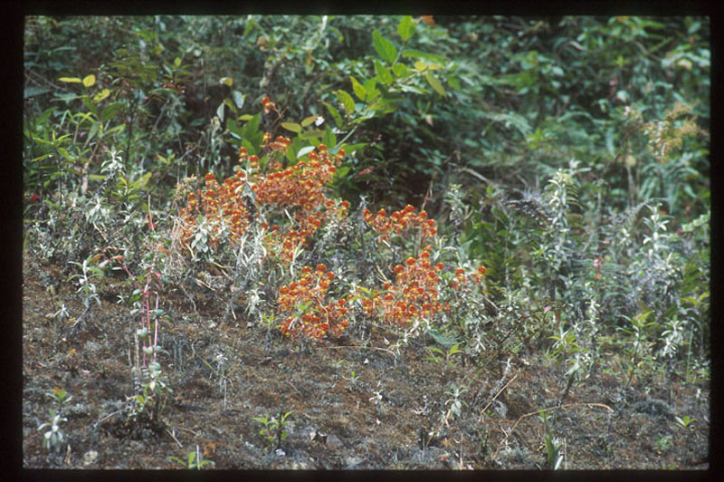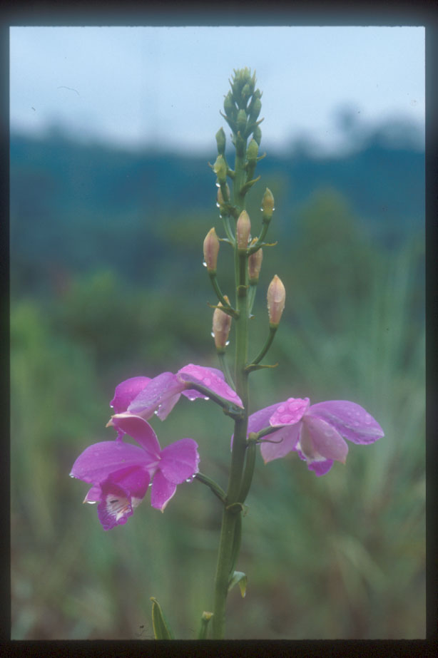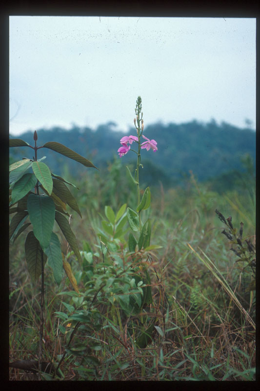 毎年増水すると水没する川原の開けたところEpistephiumが自生していた。草丈1.5m近くに達シ、レリアのような非常に美しい花を穂状につける。地生ランではあるが、Vanilla属に近縁。地中の根は直径約1cm、横走する。 |
