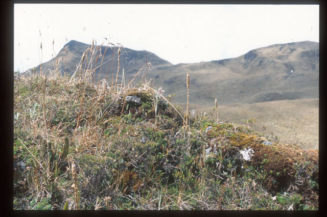 画面中央に直立する棒状の植物。この高さでは赤道直下といえどもさすがに寒く、日中でも防寒着が必要。付近には近縁属のAltensteiniaが地生し,岩壁にはプレウロタリス族のDraconanthesが見られた。 |