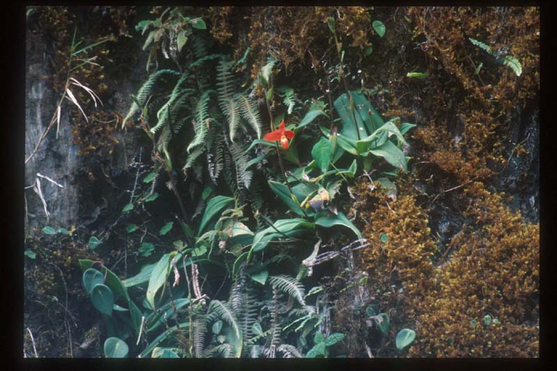 標高2000m前後の雲霧林。ほぼ垂直のコケに覆われた崖に自生していた。昔は沢山あったそうだが、乱獲され今では地上から10m以上のところにしか残っていない。写真は夕闇迫る頃、500mmのレンズでやっと撮影したもの。