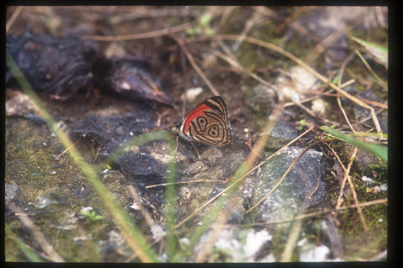 これまでに3度エクアドルに行き、何回か大きなチョウにも出くわしたが、撮影したのはこれだけ。モンシロチョウとシジミチョウの中間位の大きさだった。同行していただいた三菱商事の和田氏に俗名を教えて頂いたが、メモし忘れた。模様が数字のようで特徴がある。 |