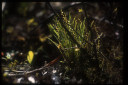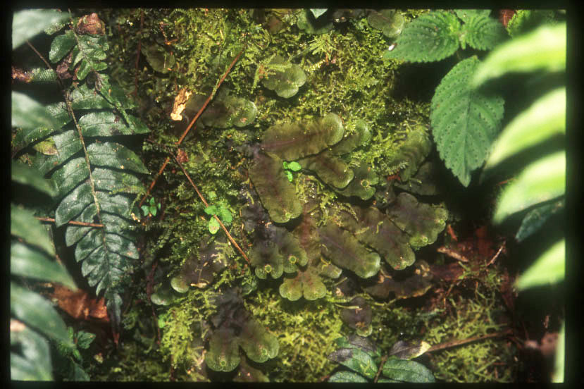 コケ類は世界中に分布する属が多い。葉状体の表面に細毛が密生するので「ケゼニゴケ」と名付けられた。先端近くにある円形のものは、杯状体と呼ばれる小さな杯、中に多数の無性芽が形成される。 |