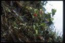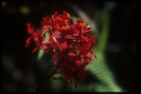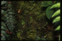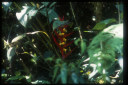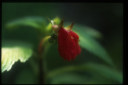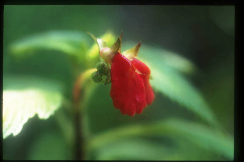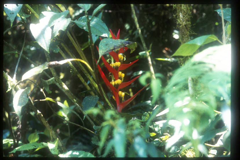 熱帯雲霧林の林床には、科も属もよく判らない植物が無数に自生している。写真の植物は、小さな渓流沿いの湿度の高い場所に生育していた。花は鮮やかな朱紅色、長さは3cmほどで非常に目立った。 |