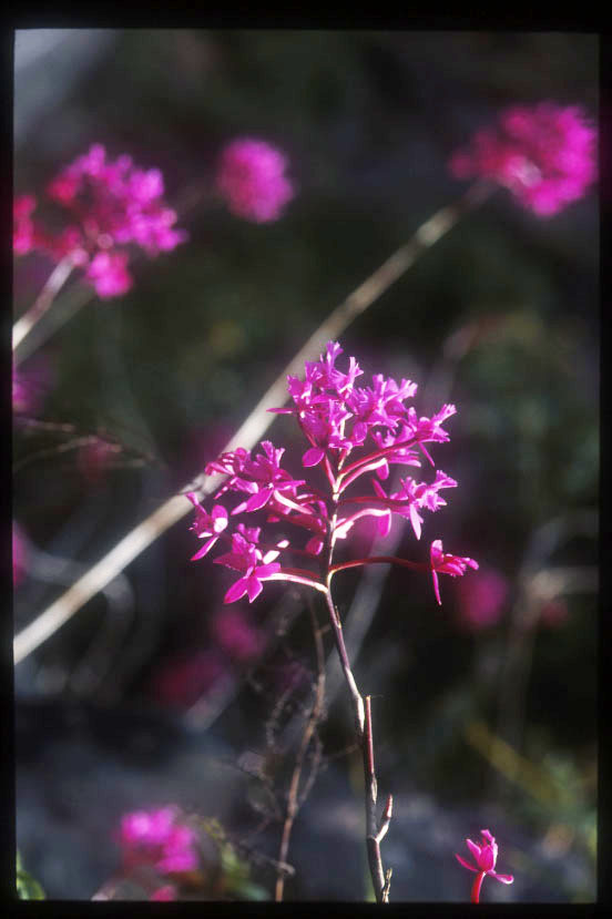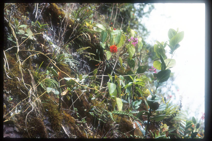 Oncidium, Cyrtochilum, Sobraliaなどの乾燥に強く、十分な光線を必要とするランが自生している。朱色の花の種と、桃紫色の花の2種が混生している。 |