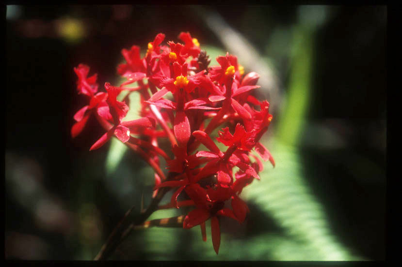 Eric Hagsatar氏が目下エピデンドラム属を研究している。文献だけ見ていると同定できそうだが、現地でいろいろな種に出会えば出会うほど同定の難しさが判り、軽率に種名は書けない。唇弁と唇弁基部のトサカ状突起の形態が手がかりか。 |