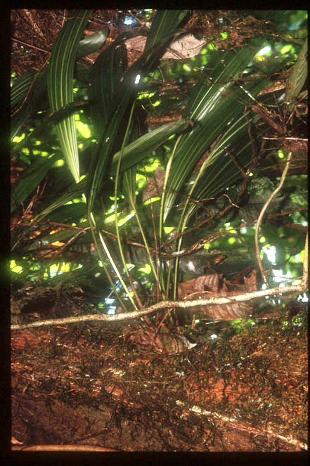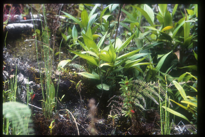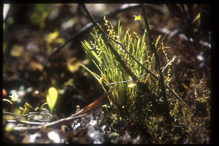 macranthaと思われる。左側の棒状の植物はトクサ(Equisetum)、枯れた葉はウラジロ(Gleichenia)の一種。 |