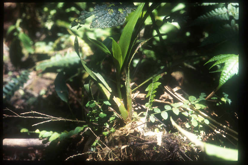 多分白色の花のtortilisであろう。朽ちかけた倒木上に生育していた。8月下旬で現地はまだ乾期であったために花はなかった。エクアドルでは年間を通じほとんど気温が変化しないので、灌水さえすれば乾期でも開花するとのことである。 |