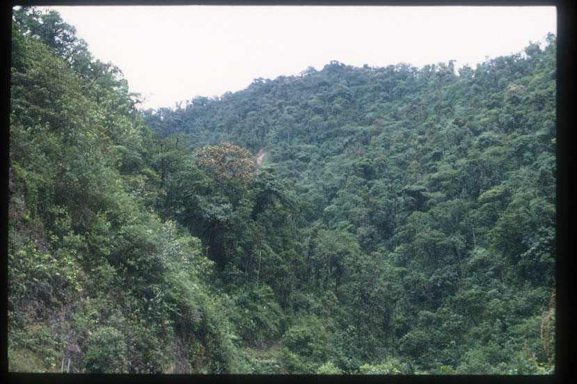キトの中心から車で1時間ほどのカラカリ(Calacali)。わずかに細い山道があるだけの原生林。標高が低いので林内は3,000m前後の雲霧林ほど湿っていないが、さすがに植物は豊富である。 |