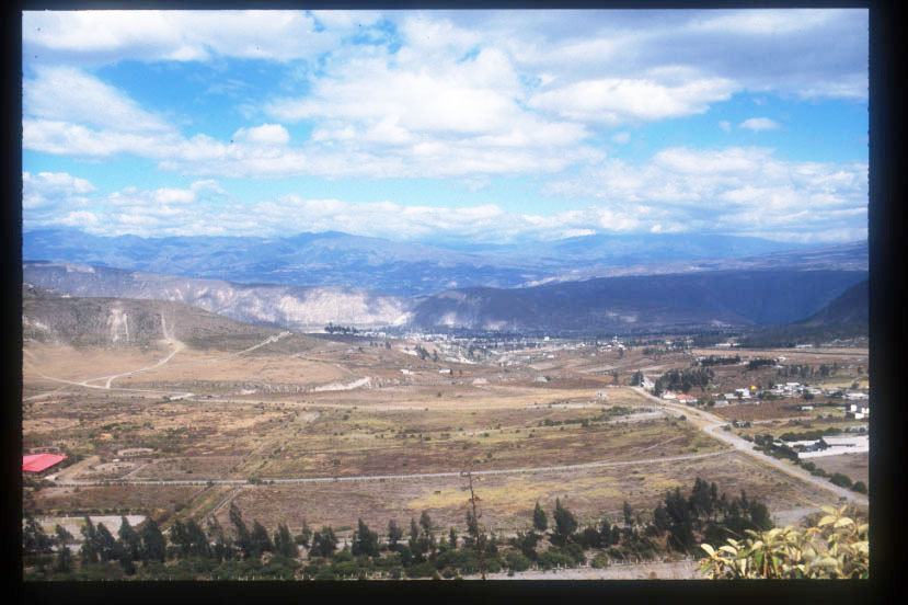 キトはエクアドルの首都。3000m以上の高い山に囲まれた標高約2、800mの大きな盆地にあり、人口は約80万人の大変美しい都市。ホテルの窓から遙か彼方の丘の上の大きな銅像を望む。 |