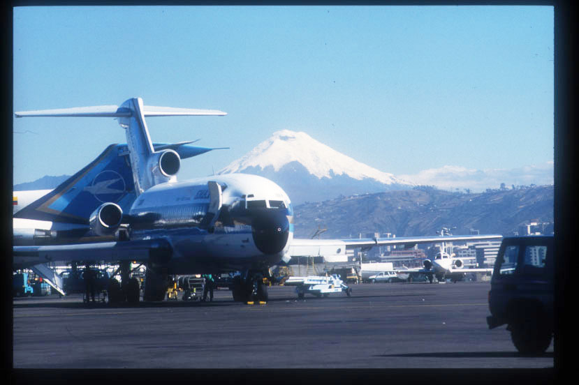 飛行機の横に見える山はエクアドルを代表する火山「コトパキシ山」。標高5、897mで、年間を通し4800m以上は万年雪をいただく。ちなみにこの写真は、キト空港にて撮影した。 |
