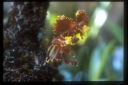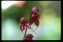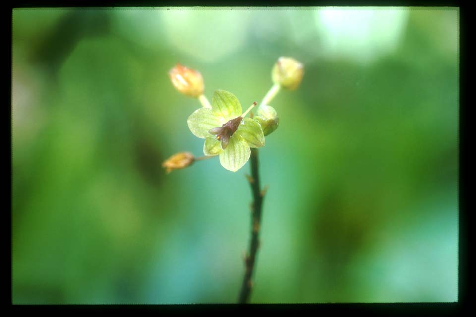 花の直径は1cm以下、順番に数花が咲く。葉はほとんどなく、クモランのようである。花をよく観察すれば判るが、Telipogonに近縁の属である。唇弁が肉質化し退化している。ずい柱の翼片も肉質化している。ずい柱と唇弁の形は、ハエに似ているかな? |