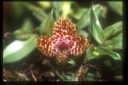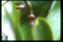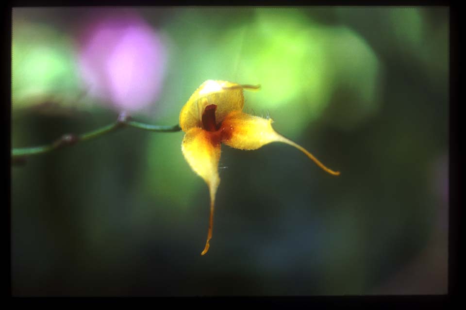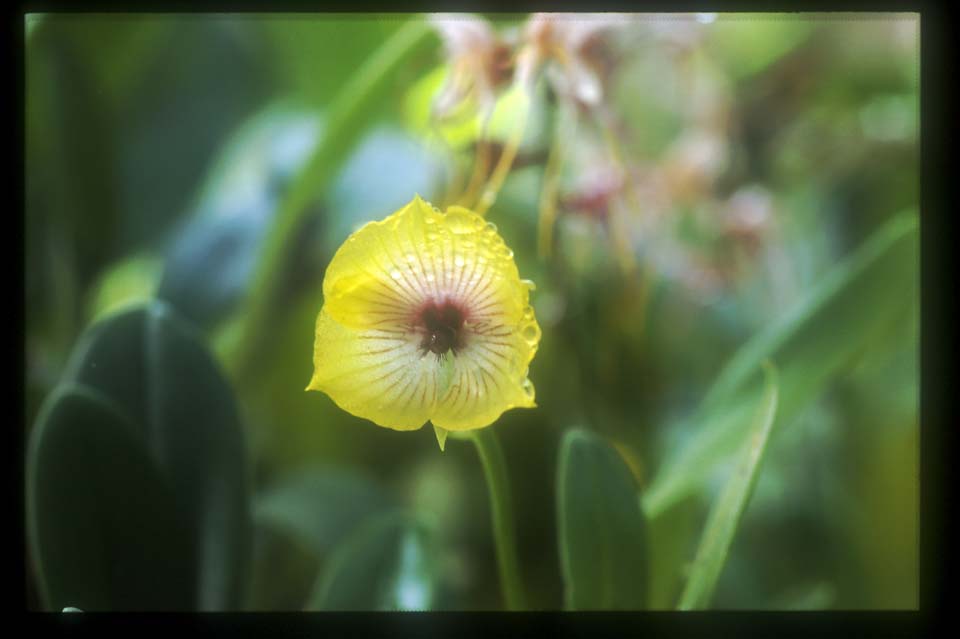 典型的なテリポゴン属の花。花は大きく直径5cm以上、弁質が薄いので花持ちは悪い。低温で空中湿度が高い環境下に生育するので、日本国内での栽培はほとんど不可能。現地でも雲霧林の減少とともに、数も減っているようだ。 |