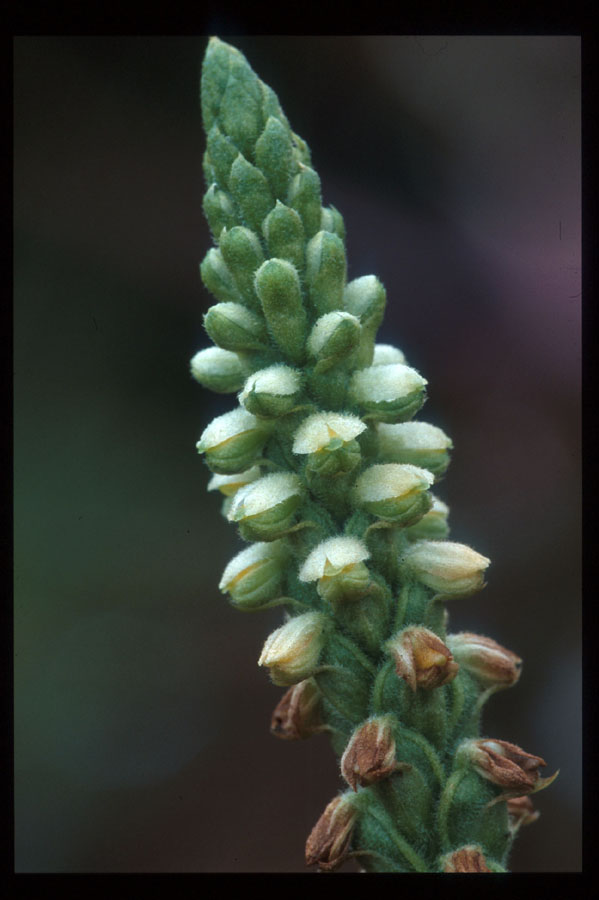 6.Gomphichis valida 前種と同じ場所にあった。Aaほどではないが、全面が細毛に覆われる。花は殆ど開かないにも拘わらず、ほぼ総てが結実しているので、自家受粉なのだろう。しかも、あっという間に種子は熟す。拡大 |
