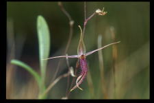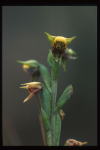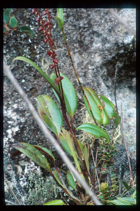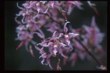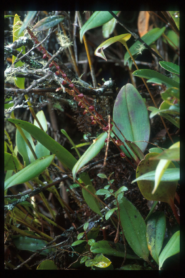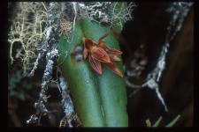 | 1.Telipogon sp. 草丈は40cm前後で直立し、先端に2−3花がつき、この属としては特殊な型。新芽は先端近くから生じるので、古い部分は倒れて匍匐する。湿度が高いためであろう。拡大 |