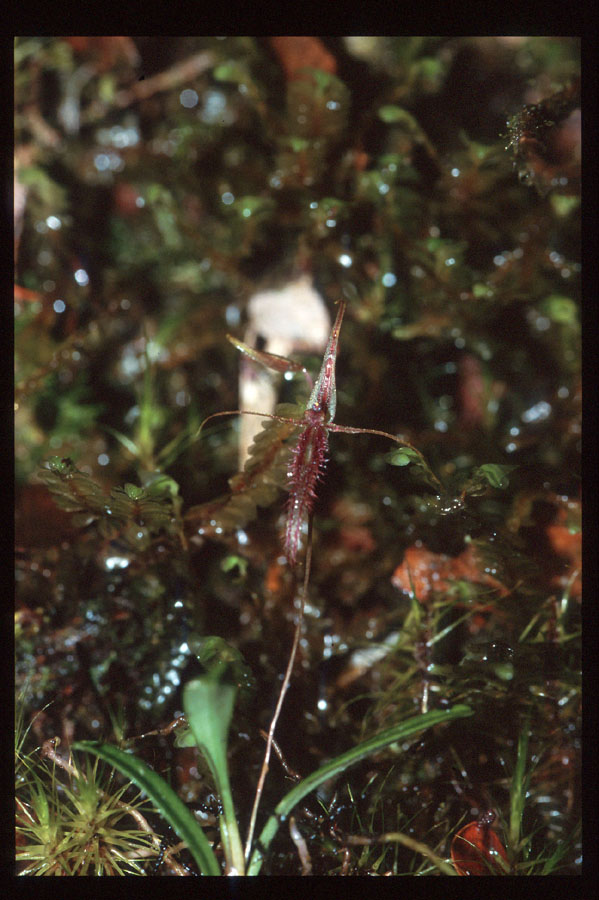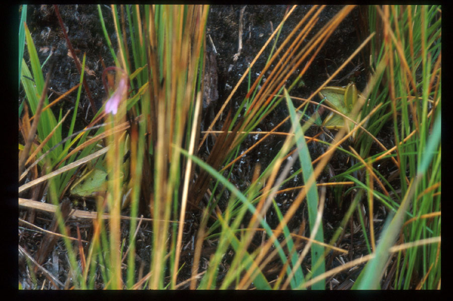 8.Pinguicula(ムシトリスミレ属) sp. 4.5.6と同じ場所にあった。ロゼットの直径は3−4cm、土はいわゆるケト土。平坦で湿地ではないが、霧が深いために土はいつも湿っているのだろう。丁度開花期だった。この食中植物は、新旧どちらの大陸にも分布しているのが面白い。拡大 |