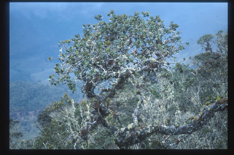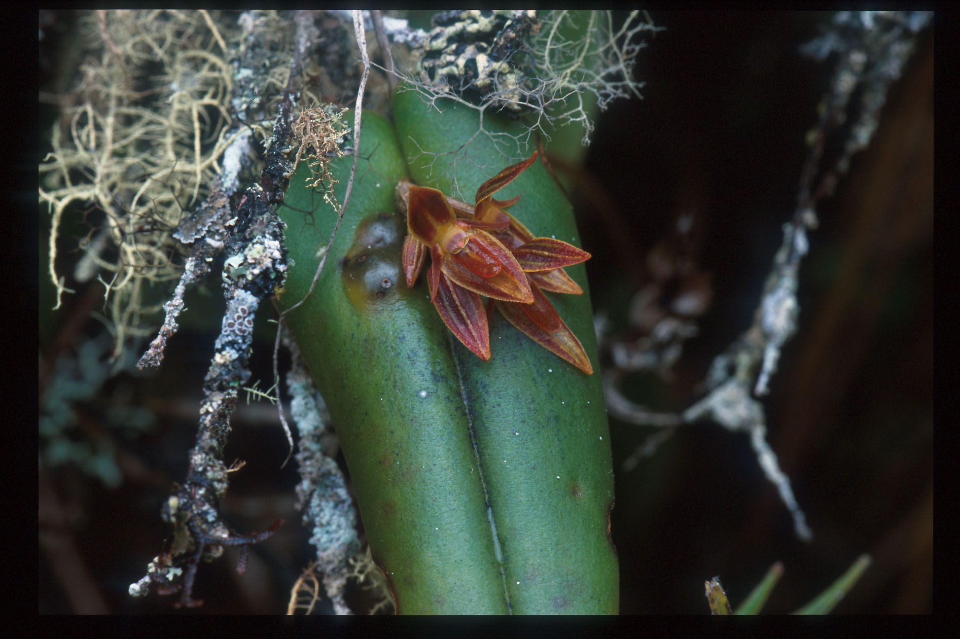 4.Pleurothallis sp. いかにもプレウロタリスといった種。晴れれば紫外線が強い直射日光を受けるので、葉は硬い革質。しかし少なくとも夕方から朝までは霧に包まれるので空中湿度は高く、地衣類と混生する。拡大 |
