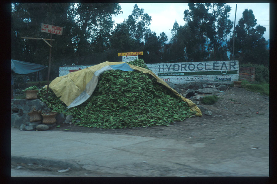 | 1.バナナの山 エクアドルの最大の輸出品は、バナナ。商品にならない未熟のバナナは、このように所々に山積みされ、付近の家畜の餌に供される。さすがにバナナの国である。拡大 |