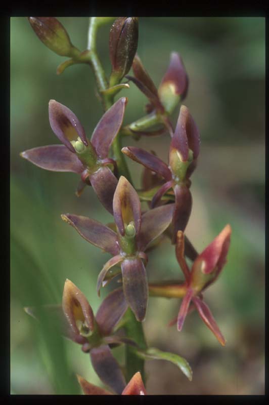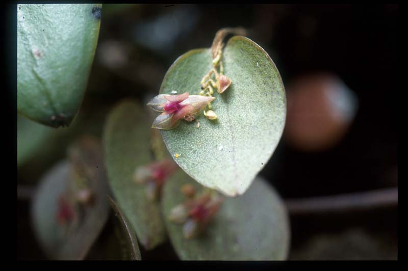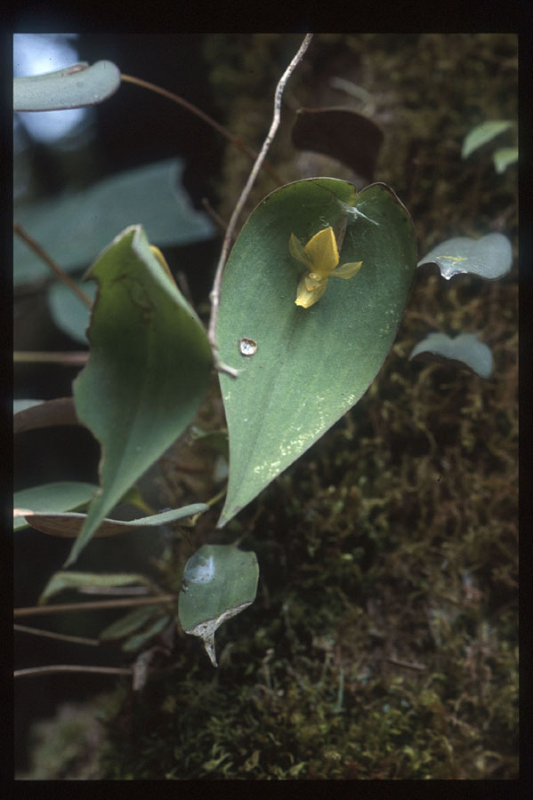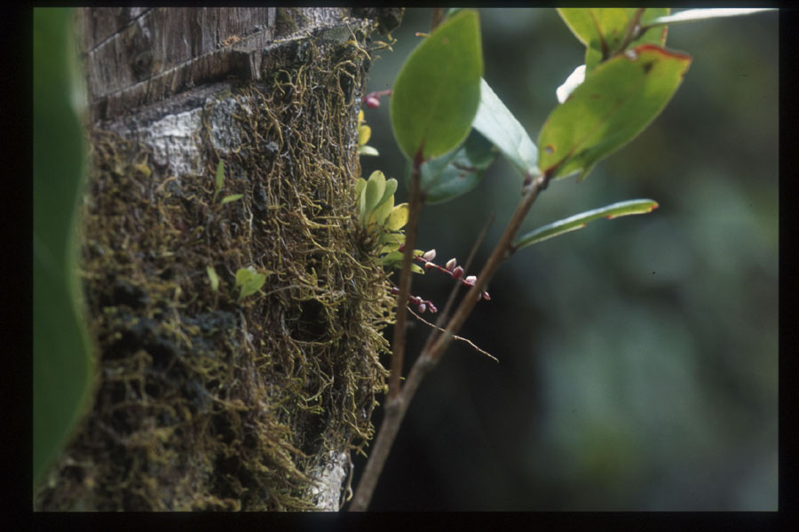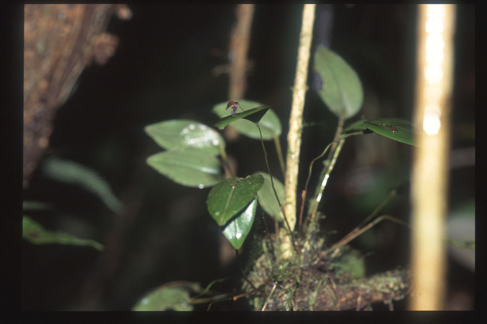 | 9.Pleurothallis Draculaなどの目立つランには出くわさなかったが、Pluerothallis,Stelis等は多かった。全般的に、低地林は高地の雲霧林よりランの種数は少ない。この種の花は、濃紫褐色で小さい。拡大 |