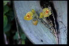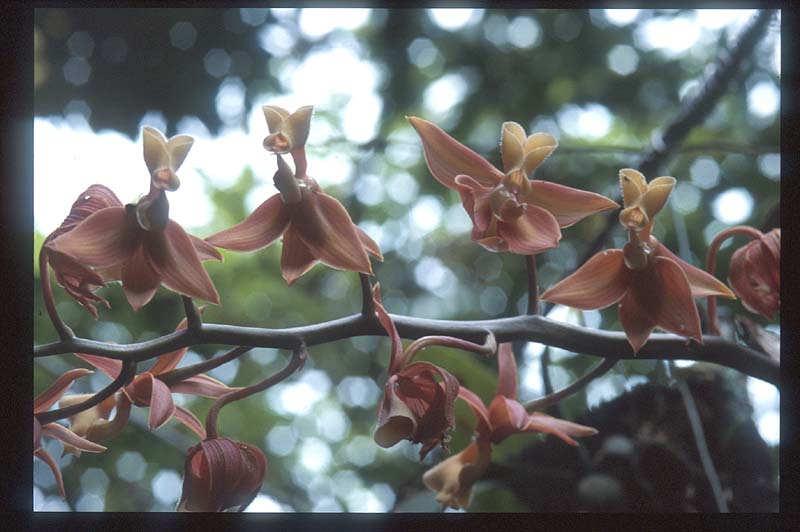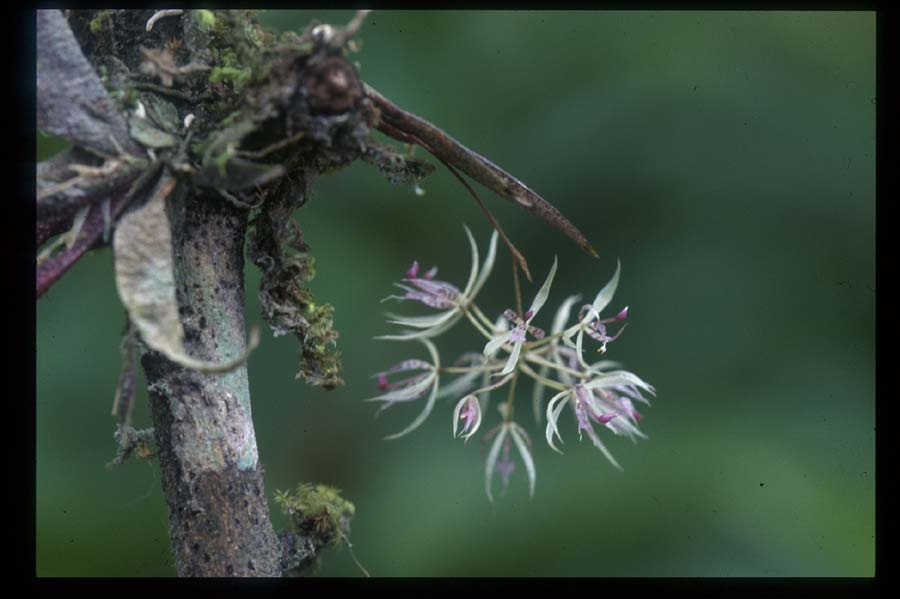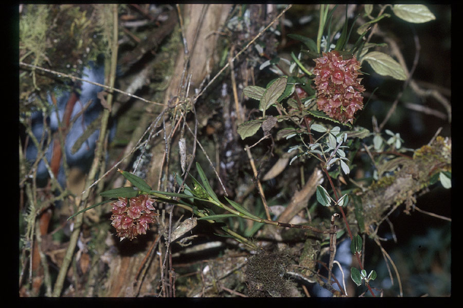 7.Epid. lloense エピデンドラムとしては、やや珍しい肌色。直径2cm前後の大きな花がブドウの房のような花序をなし、なかなか見応えがある。標高2800m前後の小さな谷沿いの樹幹に着生。拡大 |