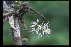 6.Stelis odobonella 5と同じ場所、小型のステリスで、花茎長は5-6cm、花は湿度が低下すると閉じる。ずい柱両側にある柱頭の部分がセイウチの歯のように伸長することに因む(命名者ルアー博士による)。拡大 |