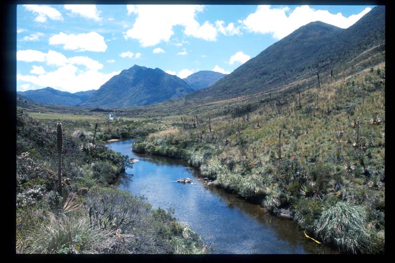 2.峠の先はアマゾン 正面左奥の峠を過ぎると雲霧林に覆われたアマゾン側斜面となるが、峠までは乾燥した草地。所々には、花が咲くまでに100年かかるといわれているPuya(プーヤ)が散在する。拡大 |