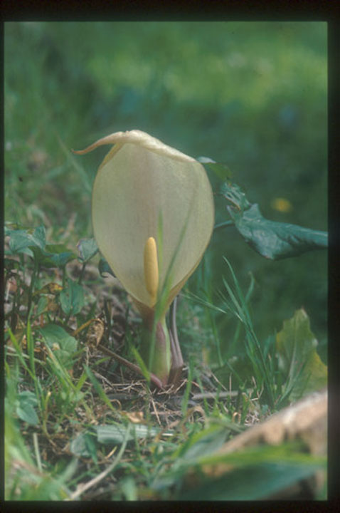 | 6.Arum maculata やや湿った草地に生育する。ミズバショウの仲間であるが、高さは20cm位の小型種。白色の部分は苞葉、中央の黄色のロウソク状のものが花の集まった肉穂花序 |