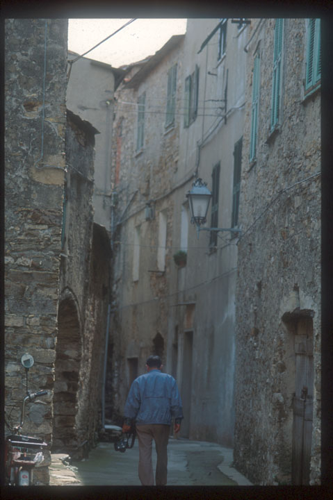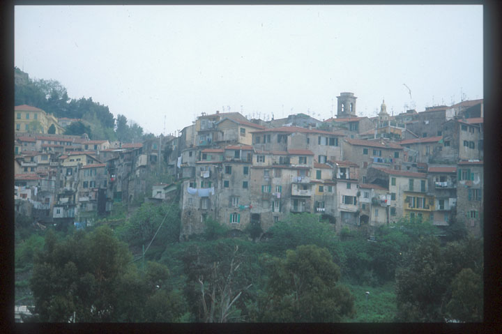 | 2.シープレッサ村遠景 フランス領ニースから車で1時間ほどのイタリア領にある。外敵からの侵略に対し、防御しやすいように山の尾根沿いに形成された村。我々はこの村に住む、Karremans氏の家(築1200年以上)に泊めてもらった。 |