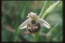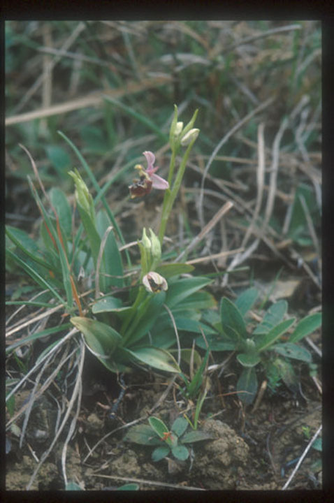 | 10.Ophrys apiferaの自生状況 開けた草地で、より大きな他の植物と混在する。群生することはなく、せいぜい2-3個体づつが点在する。石灰岩地で、表土は薄い。草丈20cm以下。 |