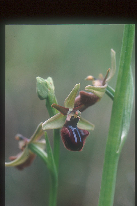 15.Ophrys bertlonii 海岸に近い低地(100m)から700- 800mの山中にまで分布する。草丈20cm以下で、花数も少なく、せいぜい数花。唇弁中央のリング状の模様が特徴。 |