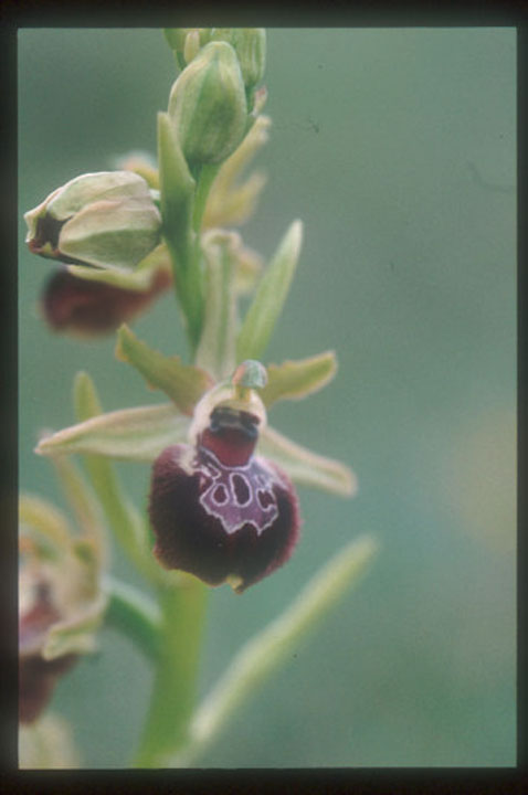 12.Ophrys holoserica apifera に非常によく似た種だが、唇弁の模様が異なる。両種が並んで生育していることもあった。草姿、草丈も殆ど同じ。 |