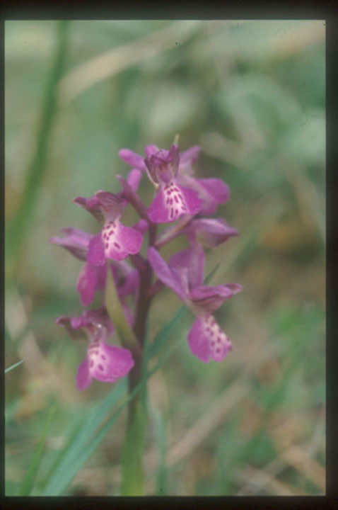 11、Orchis morio 前種と混在、あるいはやや湿った草地に生育する。草丈20cm前後になるが、花数は10以下。唇弁の中裂片に斑点がある。 |