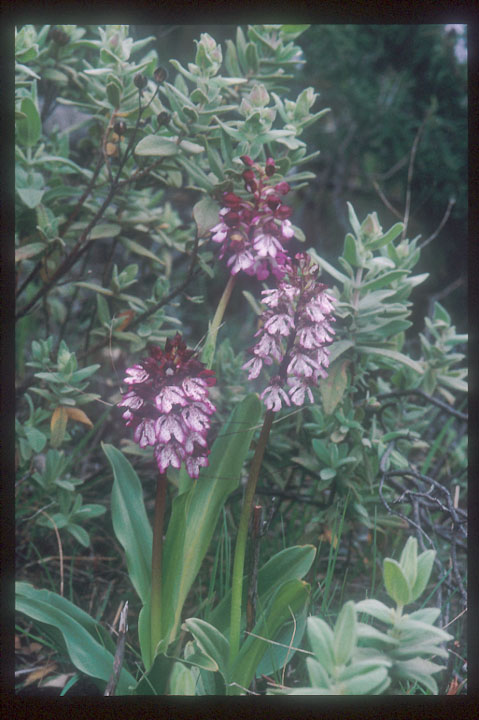 20.Orchis purpureaの生育状況 Barlia同様、湿った肥沃な土地を好むようである。花序には20-40花が蜜に付く豪快な地生ランである。 |