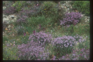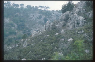 | 1.イタリアとフランス国境付近の山 イタリアとフランスの国境となるモナコ周辺では、海岸線から車で20-30分も入ると、標高数百メートルに達する。石灰岩から成り、ほとんどは乾燥気味であるが、所々に腐植土が堆積し、やや湿った環境もあり、結構変化に富んでいる。 |