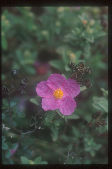 | 4.Cistus creticus いわゆるハマナスの仲間。海岸線に近い標高の低い疎林内で見かけた。乾燥に強く、夏の暑さにも耐えられそうなので、日本で栽培したくなるほど可愛らしい。個々の花の花期は短いが、複数の花が連続して開花するので、結構楽しめそうである。拡大 |
